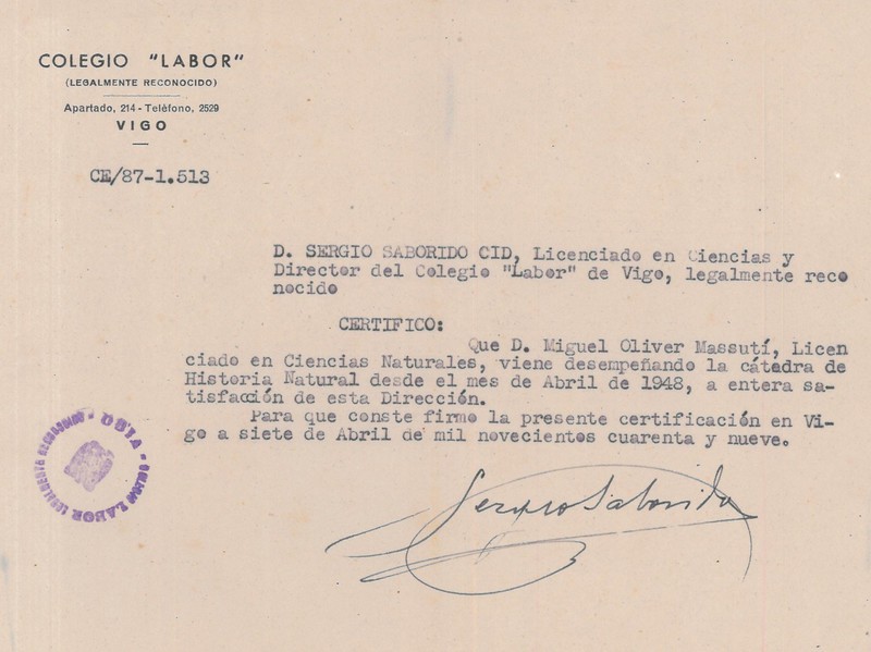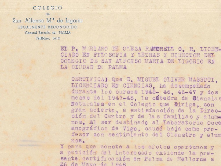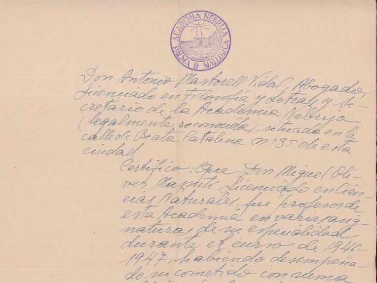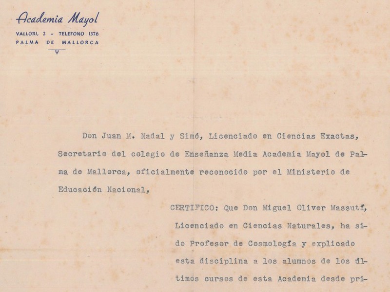 Entre los años 1946 y 1949 impartió clases en diferentes centros educativos y de diferentes asignaturas de ciencias, como muestran los certificados que se conservan, entre ellos el del Colegio Labor de Vigo del que Miquel Oliver tenía un especial recuerdo o el de la Academia Mayol de Palma donde fue profesor de Cosmología.