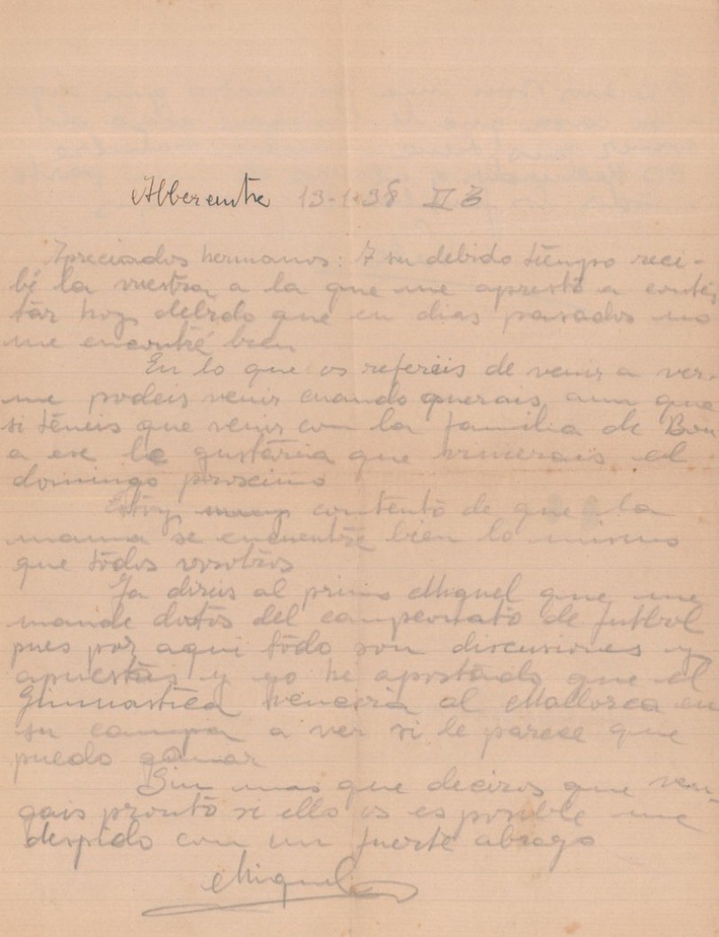 Ya diréis al primo Miquel que me mande datos del campeonato de futbol, pues por aquí todo son discusiones y apuestas y yo he apostado que el Gimástica vencería al Mallorca en su campo, a ver si le parece que puedo ganar.