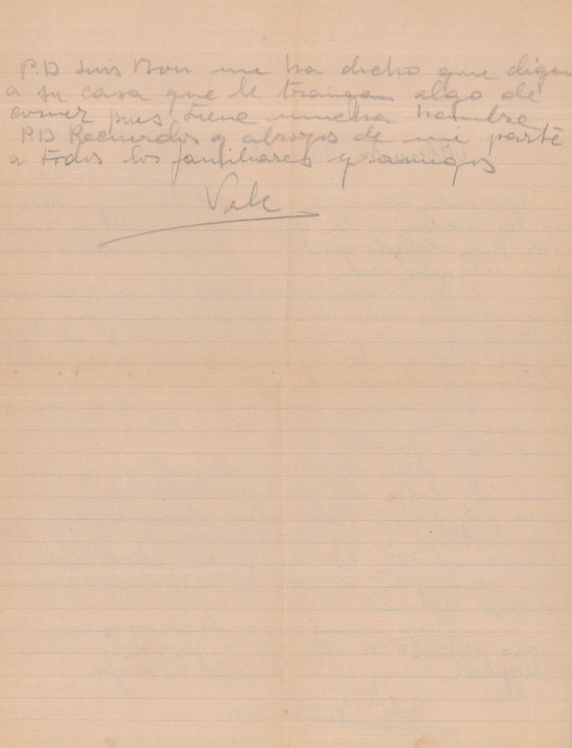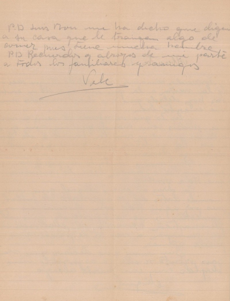 P.D. Luis Bou me ha dicho que digáis a su casa que le traigan algo de comer pues tiene mucha hambre.
