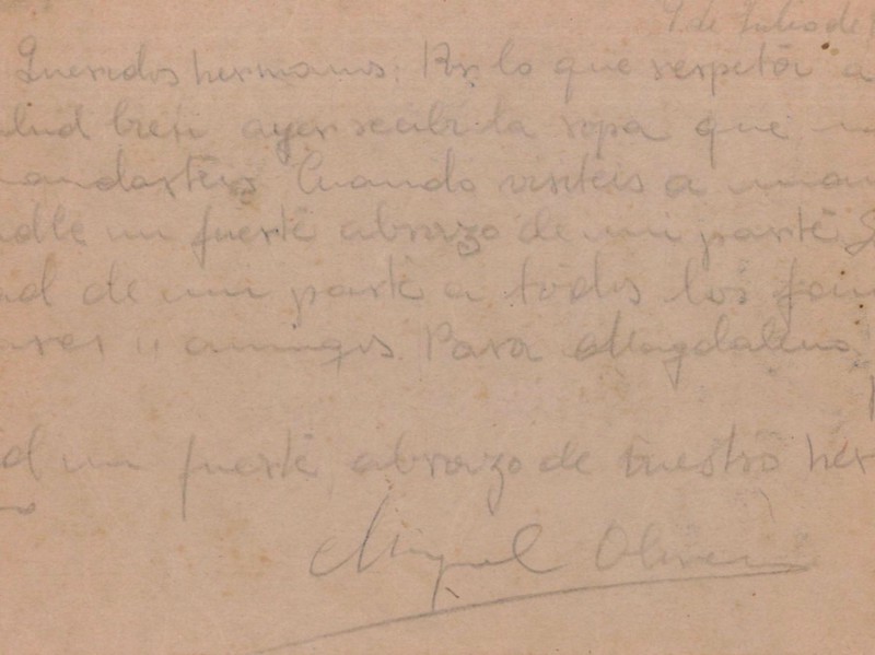 Queridos hermanos: por lo que respecta a la salud bien, ayer recibí la ropa que me mandasteis. Cuando visitéis a mamá dadle un fuerte abrazo de mi parte. Saludad de mi parte a todos los familiares y amigos. Para Magdalena (frase borrada). Recibid un fuerte abrazo de vuestro hermano,