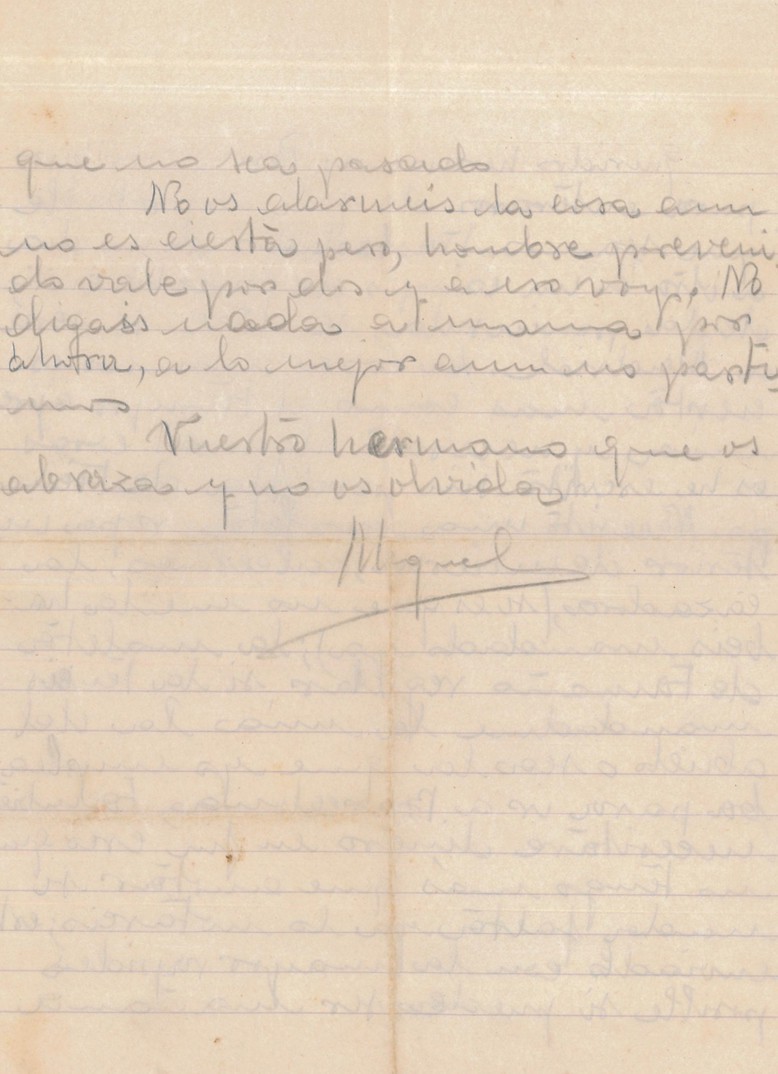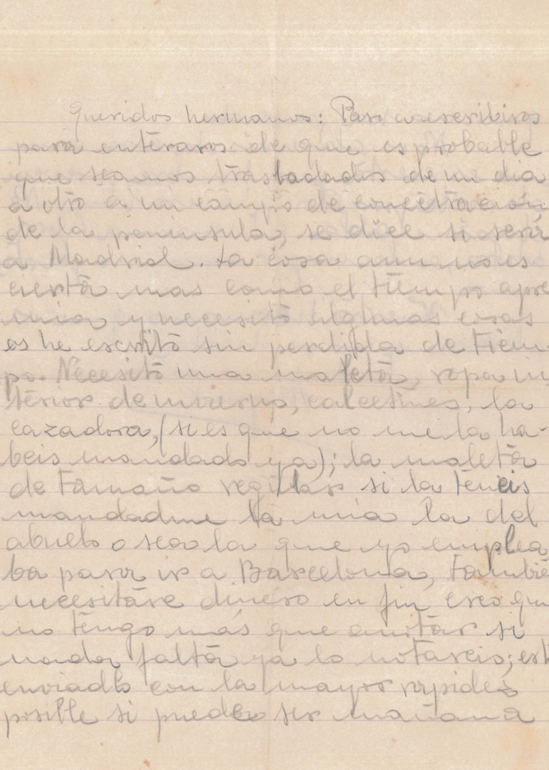 Queridos hermanos: Paso a escribiros para enteraros de que es probable que seamos trasladados de un día a otro a un campo de concentración de la península, se dice si será a Madrid. La cosa aun no es cierta, mas como el tiempo apremia y necesito algunas cosas os he escrito sin pérdida de tiempo. Necesito una maleta, ropa interior de invierno, calcetines, la cazadora (si es que no me la habéis mandado ya ); la maleta de tamaño regular si la tenéis mandadme la mía, la del abuelo o sea la que yo empleaba para ir a Barcelona, también necesitaré dinero, en fin creo que no tengo mas que anotar si mandar falta ya lo notareis, esto enviadlo con la mayor rapidez posible si puede ser mañana que no sea pasado.