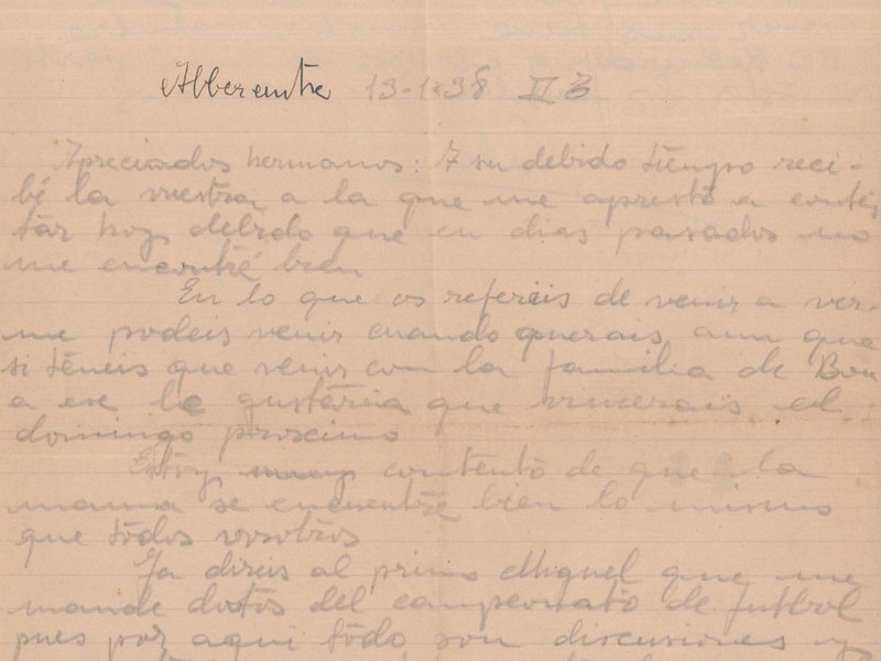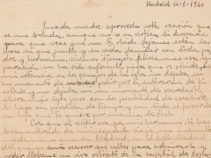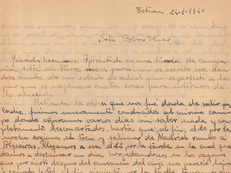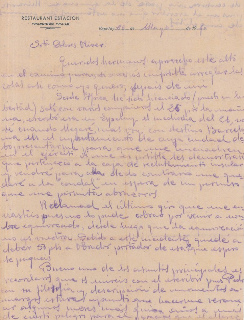 El 26 de mayo de 1940, un día después de abandonar África, en la primera parada en la península, Miquel puede escribir a sus hermanos para explicarles la situación en que se encuentra y sus planes para llega a Mallorca. Es una carta entregada en mano por uno de los compañeros que viajaron directamente a la isla y, por eso, Miquel aprovecha para advertir a sus hermanos sobre la censura del correo y el peligro de describir "momentos amargos" en las cartas.
