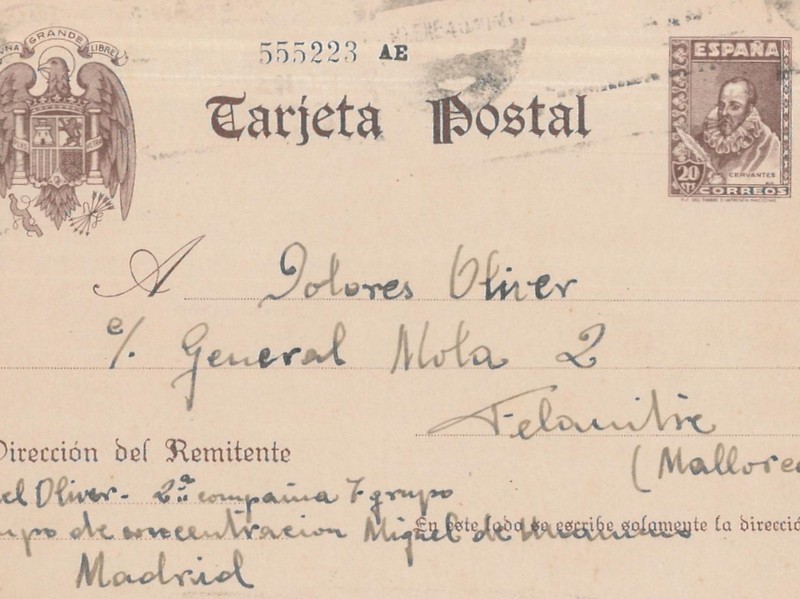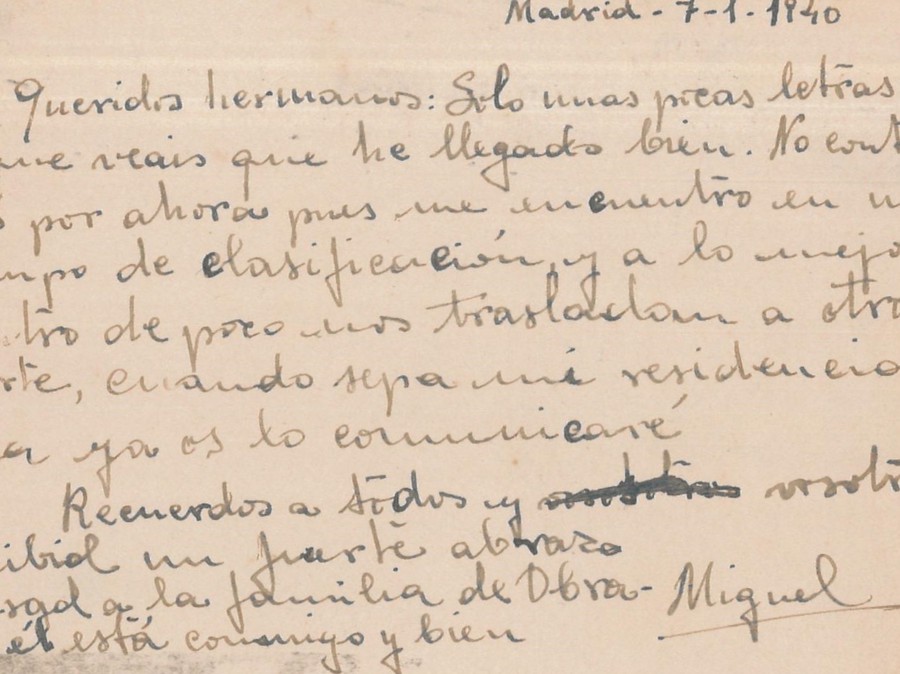 Queridos hermanos: Solo unas pocas letras para que veáis que he llegado bien. No contestéis por ahora pues me encuentro en un campo de clasificación y a lo mejor dentro de poco nos trasladan a otra parte. Cuando sepa mi residencia fija ya os lo comunicaré.