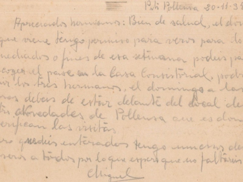 Apreciados hermanos: Bien de salud, el domingo que viene tengo permiso para veros, para lo que a mediados o fines de esa semana podéis pasar a recoger el pase en la Casa Consistorial. Podréis venir los tres hermanos el domingo a las 10 horas, debéis de estar delante del local Teatro Novedades de Pollensa, que es donde se verifican las visitas.