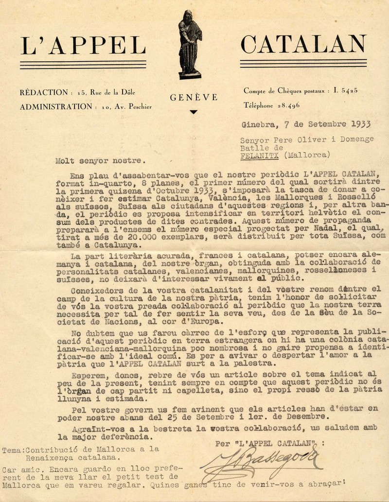 Durante su etapa en el exilio Pere Oliver Domenge no perdió el contacto con la acción política en España y en Cataluña. A pesar de la distancia se pudo conservar parte de la correspondencia mantenida con otros españoles y catalanes en el exilio.