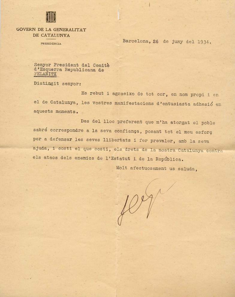 Tenc devant meu la vostra carta de dia 5 d'agost, l'endema mateix del vostre festejat enllaç, des de Cala Figuera. [...] El vostre record en tal dia me va fer
