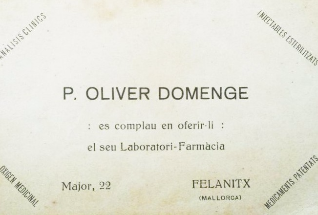 Pere Oliver Domenge nació en Palma de Mallorca en 1886. Estudió farmacia en Barcelona, donde su padre, Miquel Oliver Obrador, regentaba la Farmacia Moderna, en la calle Hospital. Después de contraer matrimonio con Catalina Massutí Alzamora, inició en Barcelona su carrera de farmacéutico, estableciéndose por su cuenta y allí nació el segundo de sus hijos, Miquel. Todo apuntaba a que continuaría su vida en la ciudad Condal, pero su tío Pere Oliver Obrador, le dejó en herencia una finca en la localidad de Felantix, en Mallorca, donde vivía toda la familia Oliver, con la intención de atraerlo hacia la isla, y lo consiguió. Estableció su casa familiar en la calle Mayor número 22 de Felanitx y en la planta baja abrió su farmacia.