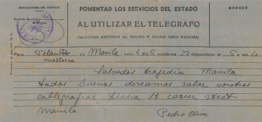 Aquí en Manila hemos pasado casi toda la dominación japonesa. Hemos sufrido, singularmente los últimos días, durante la lucha de liberación. Hubo una noche la del 13 de febrero, que todos pensamos había llegado nuestro último instante. Ametrallados por los japoneses y corriendo entre ruinas y escombros todavía no sabemos como pudimos escapar con vida. El 15 de febrero los americanos nos salvaron. Todos estamos bien. Juan, Joaquima y el niño se encuentran en casa de unos amigos catalanes en las afueras de Manila. Yo vivo acogido en la casa de otro amigo, calle de Carcer 18, cerca de la oficina que por un milagro de Dios se salvó del incendio. Hoy se ha dicho que ya se admitía correspondencia para Europa y no queriendo esperar más, os escribo sin esperar un momento, sin decirles nada a los hermanos. ( Manila, 18 abril 1945)