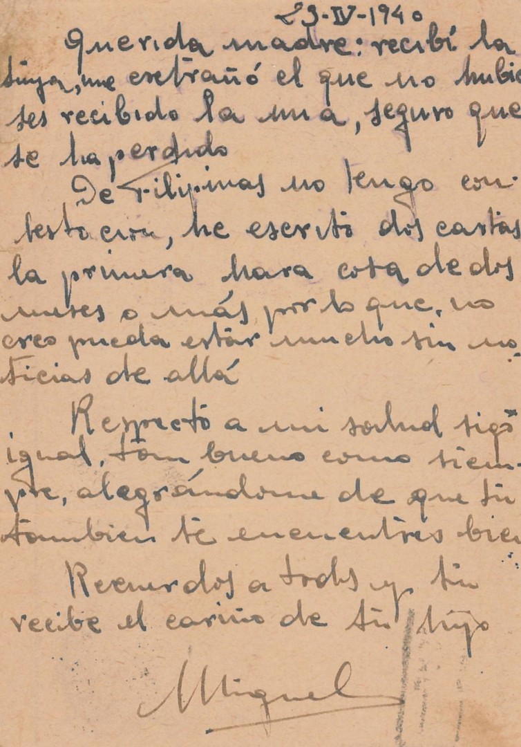 De Filipinas no tengo contestación, he escrito dos cartas, la primera hará cosa de dos meses o más, por lo que no creo pueda estar mucho sin noticias de allá.