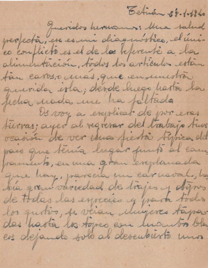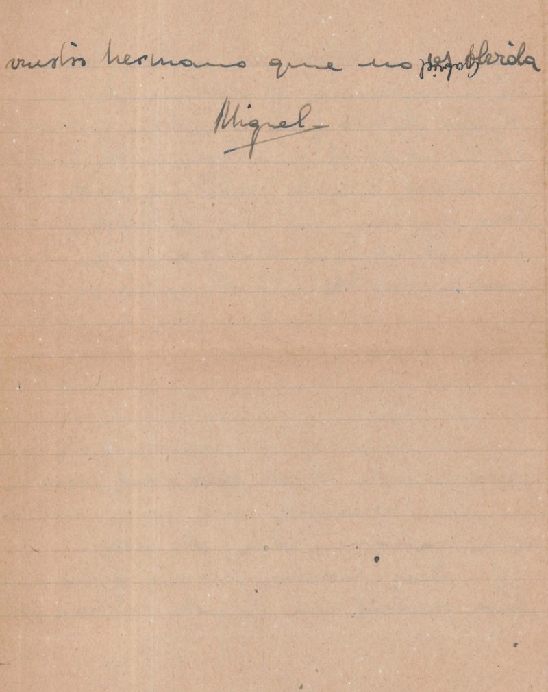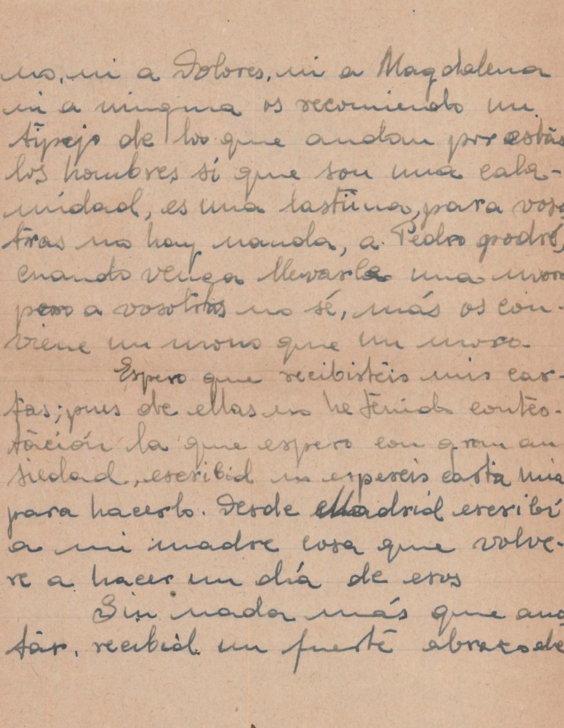 Espero que recibisteis mis cartas, pues de ellas no he tenido contestación la que espero con gran ansiedad, escribid, no esperéis carta mía para hacerlo. Desde Madrid escribí a mi madre cosa que volveré a hacer un día de esos.