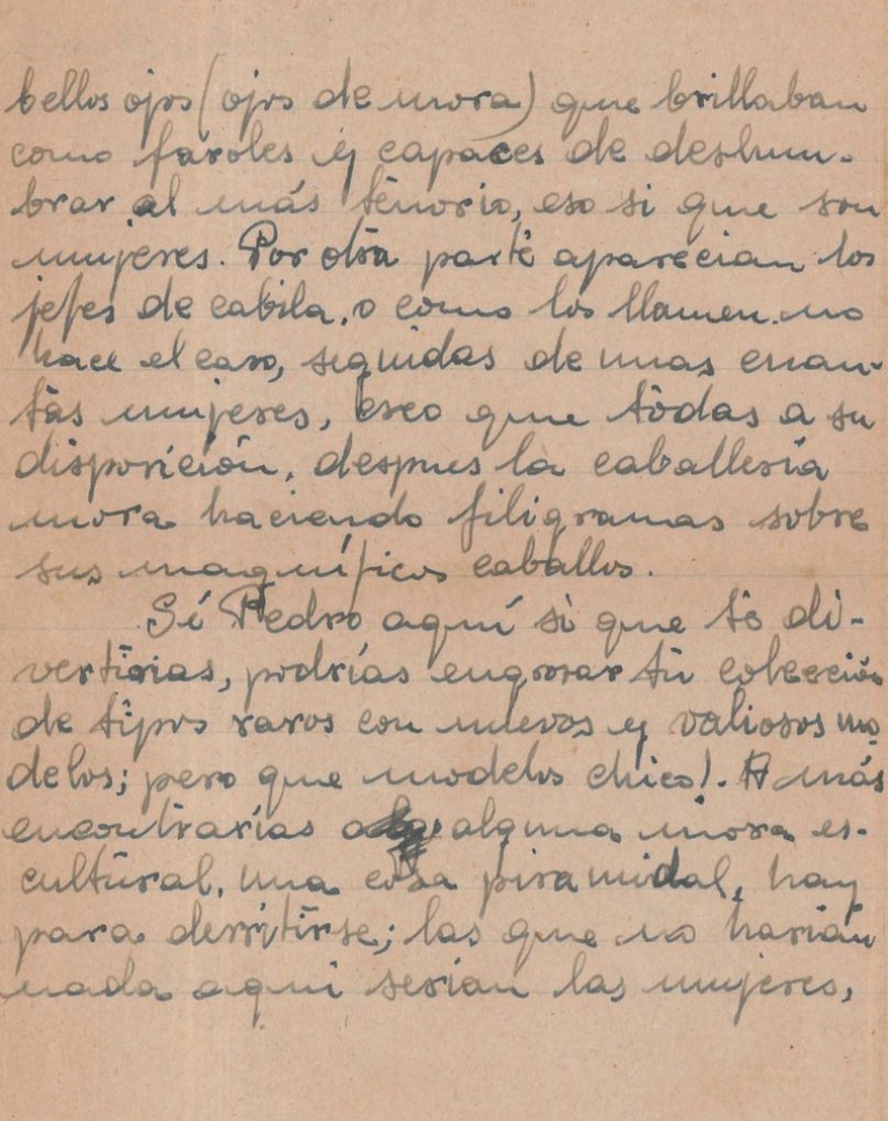 Sí Pedro, aquí sí que te divertirías, podrías engrosar tu colección de tipos raros con nuevos y valiosos modelos; pero qué modelos chico! A más encontrarías alguna mora escultural, una cosa piramidal, hay para derretirse; las que no harían nada aquí serían las mujeres, no, ni a Dolores ni a Magdalena ni a ninguna os recomiendo un tipejo de los que andan por estas, los hombres sí que son una calamidad, es una lástima, para vosotras no hay nada, a Pedro podré, cuando venga, llevarle una mora, pero a vosotras no sé, más os conviene un mono que un moro.