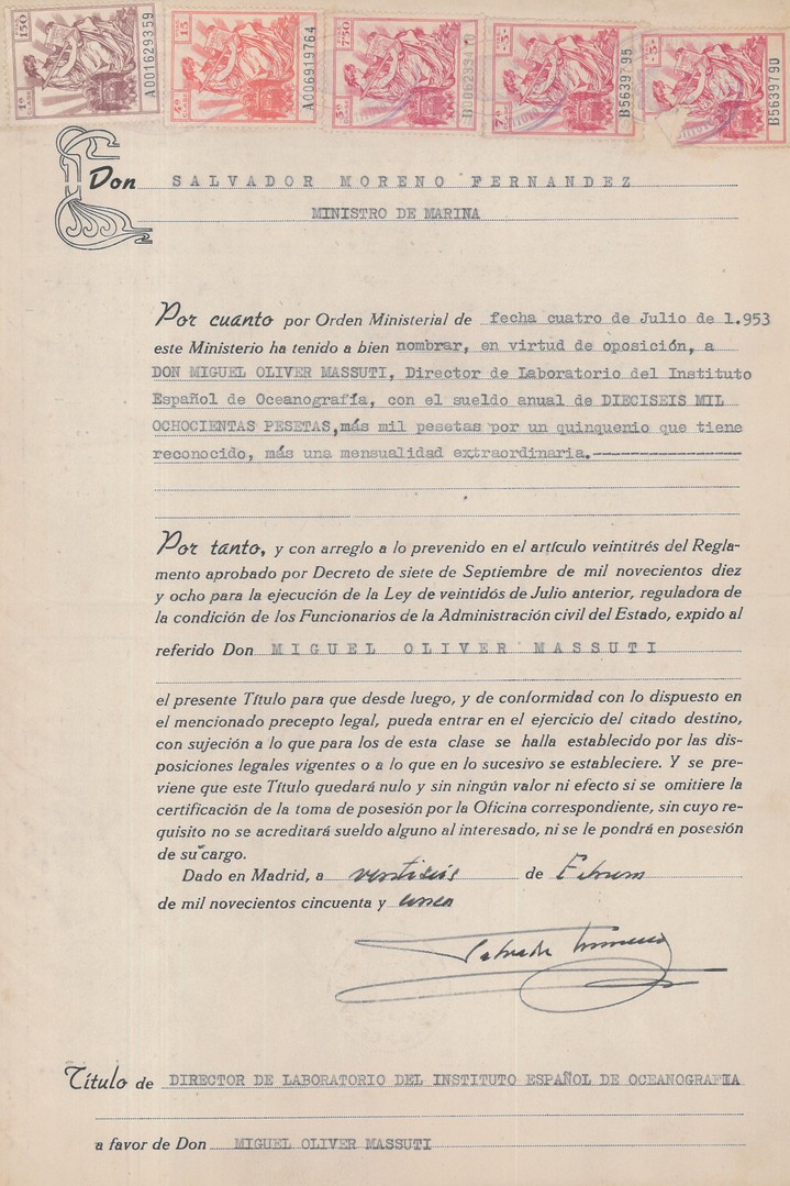 En 1953 fue nombrado Director del Laboratorio, según el documento original de nombramiento, con un sueldo anual de 16.800 pesetas.