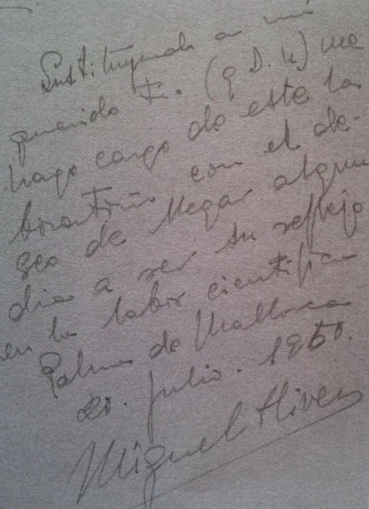 "Sustituyendo a mi querido tio (q d p) me hago cargo de este laboratorio en el deseo de llegar algún día a ser su reflejo en la labor científica. Palma de Mallorca. 20 julio 1950"
