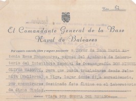l'oposició i va obtenir la plaça d'Ajudant de Laboratori de l'Institut Espanyol d'Oceanografia el 16 d'octubre de 1947 amb un sou anual de 9.600 pessetes (document original).