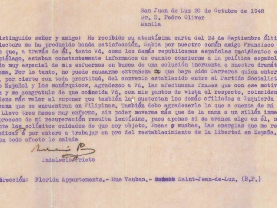 Muchos españoles están gestionando salir para España sin resultado hasta ahora. Yo, como ya os decía, voy a esperar que el negocio de Juan vuelva a tener su marcha segura y progresiva. Una vez esto asegurado, que según nuestros cálculos no puede tardar, me embarcaré y quien sabe si todos los cuatro, ellos y yo, nos embarcaremos. Ellos para ver a su madre […] yo para quedar para siempre más en vuestra compañía" (Manila, 8 julio 1945)