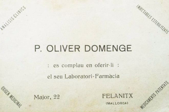Pere Oliver Domenge va néixer a Palma de Mallorca en 1886. Va estudiar farmàcia a Barcelona, on el seu pare, Miquel Oliver Obrador, regentava la Farmàcia Moderna, al carrer Hospital. Després de casar-se amb Catalina Massutí Alzamora, va iniciar a Barcelona la seva carrera d'apotecari, establint-se pel seu compte, i allà va néixer el segon dels seus fills, Miquel. Tot apuntava que continuaria la seva vida en la ciutat Condal, però el seu oncle Pere Oliver Obrador, li va deixar en herència una finca en la localitat de Felanitx, a Mallorca, on vivia tota la família Oliver, amb la intenció d'atreure'l cap a la illa, i ho va aconseguir. Va establir la seva casa familiar en el carrer Major nombre 22 de Felanitx i en la planta baixa va obrir la seva farmàcia.