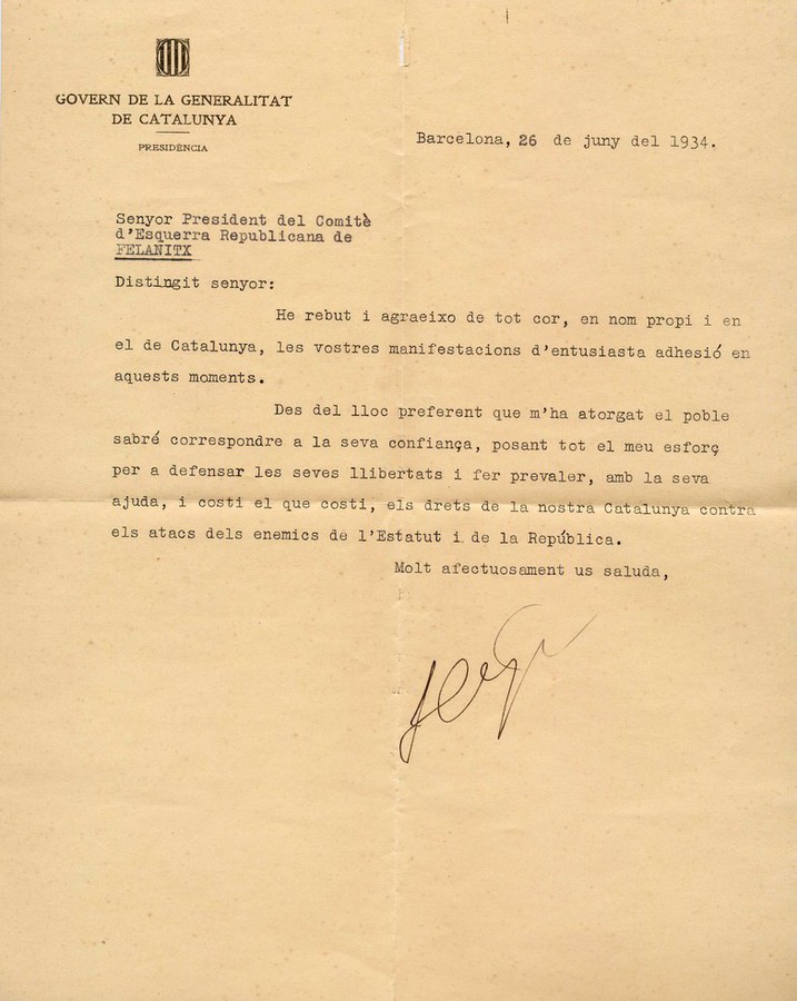 Al juny de 1936 va signar la la "resposta al missatge dels catalans"